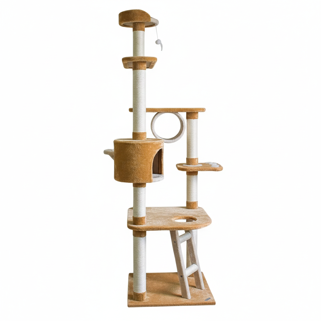 - Structure : Arbre à chat multi-niveaux avec plateformes, niche, tunnel, perchoir supérieur et jouet suspendu.