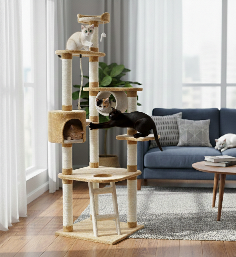 Grâce à sa structure stable et à ses multiples points d’appui, cet arbre convient aussi bien aux chatons qu’aux chats adultes, y compris dans les foyers multi-chats.